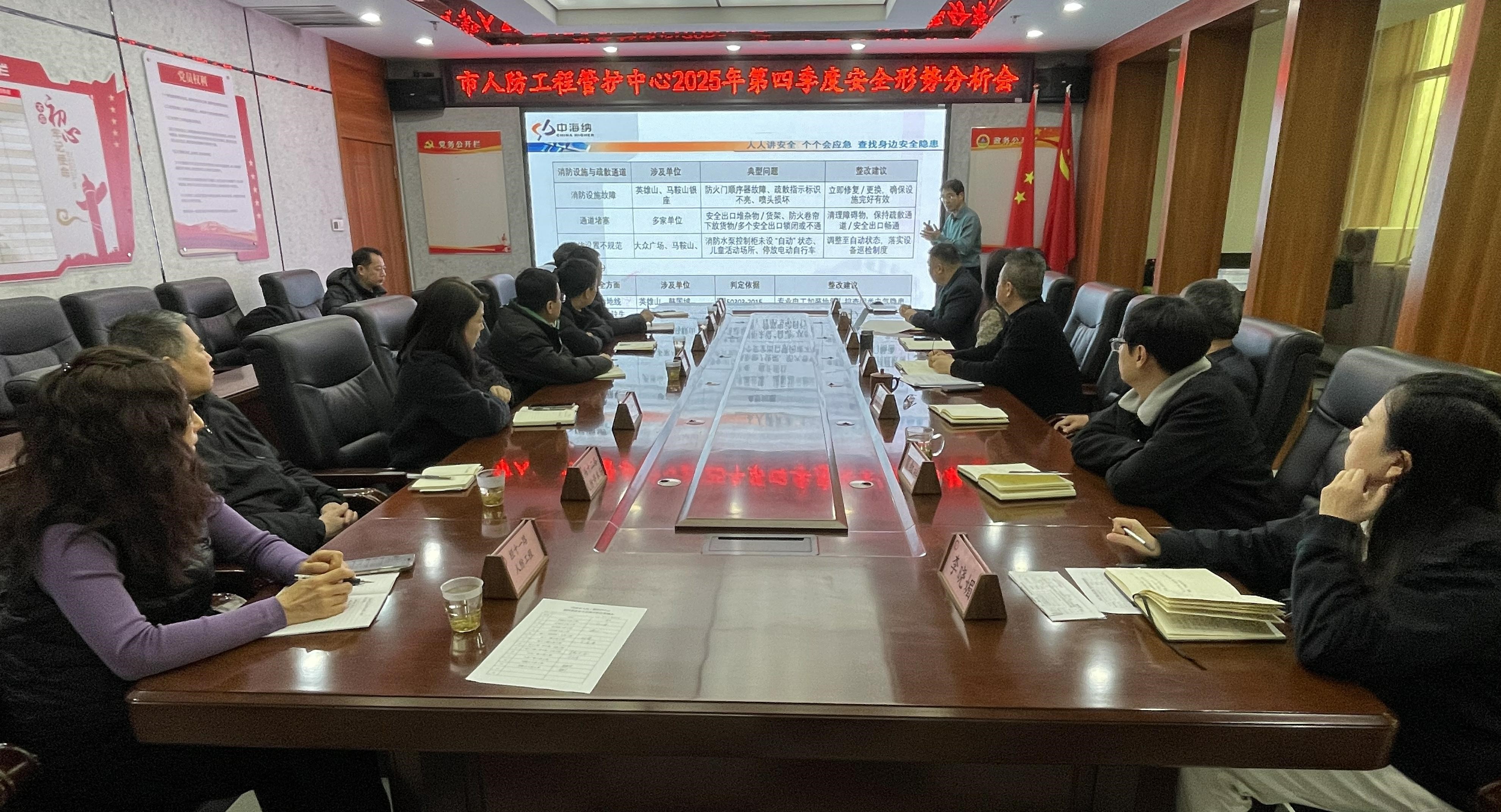 为切实做好岁末年初平安建设和安全生产各项工作,进一步压实人防工程安全工作责任,坚决预防和遏制安全生产事故发生,12月30日下午,市人防工程管护中心召开2025年第四季度安全形势分析会,梳理分析第四季度安全生产工作情况,部署下一阶段安全生产工作任务。